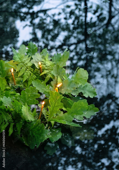 Green wreath of oak and fern leaves with candles in water. old national tradition, pagan holiday Ivan Kupala. Summer Solstice Day, Midsummer. wiccan symbol and rituals