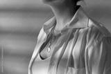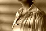 beauty, fashion and jewelry trends concept - close up of woman in white shirt wearing golden multi layer necklace with coin medallions