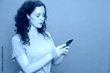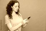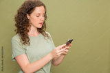 Portrait young redhead girl with curly hair smiling writing a message with green t-shirt on green background