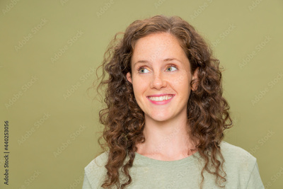 Portrait young redhead girl smiling with curly hair smiling looking up wearing green t-shirt on green background