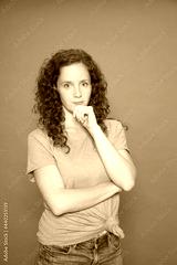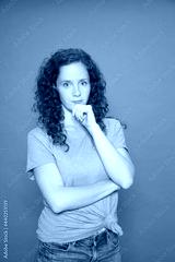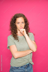 Portrait young redhead girl with hand on chin wearing green t-shirt looking at camera over pink background