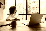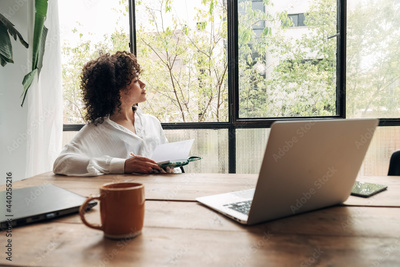 Pensive young african american woman looking out the window. Inspiration. Workspace. Taking notes.