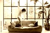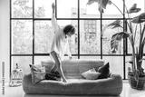 Beautiful African american young woman dancing on couch, having fun, carefree in a big, bright loft apartment