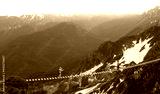 Tourist walks on rope suspension bridge on Rosa Peak (2320 m.) in Sochi, Russia. People on hanging footbridge above chasm, extreme attraction. Beautiful landscape, mountain peak in clouds and snow