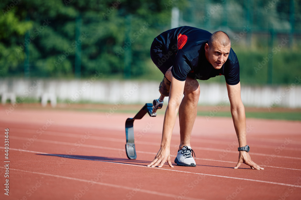 Disabled runner with artificial leg in start position on running track at the stadium.