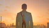 Young determined man in the city feeling confident looking to the future. Inner strength and business success concept.