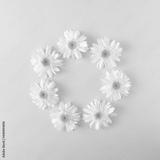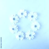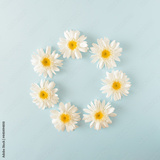 White daisy flowers arranged in a circle on a pastel blue background