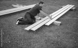 the nerdy guy is painting the wooden planks outside with cloudy weather