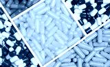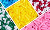 Top view colorful capsule pills in a plastic tray. Yellow, pink, red, green, and blue capsule pills. Antibiotics, vitamins, and supplements capsules. Pharmaceutical industry. Prescription drugs.