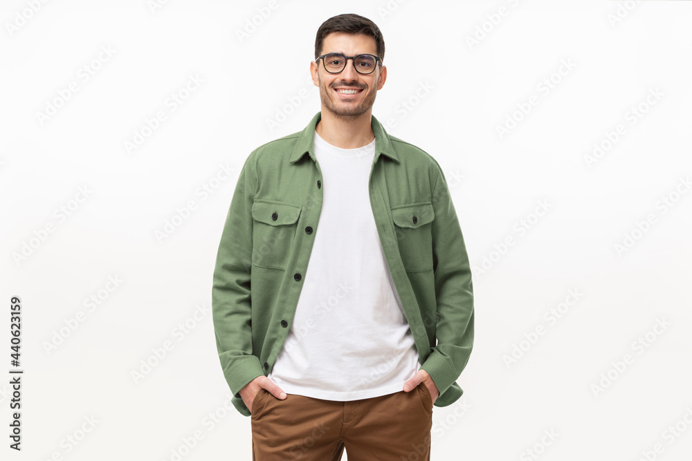 Young man standing with hands in pockets, wearing casual green shirt, looking at camera, isolated on gray background