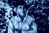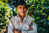 Latin man picking coffee beans on a sunny day. Coffee farmer is harvesting coffee berries. Brazil