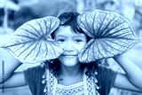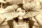 A portrait of an Asian schoolgirl enjoying the leaves of her caladium.
