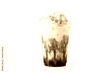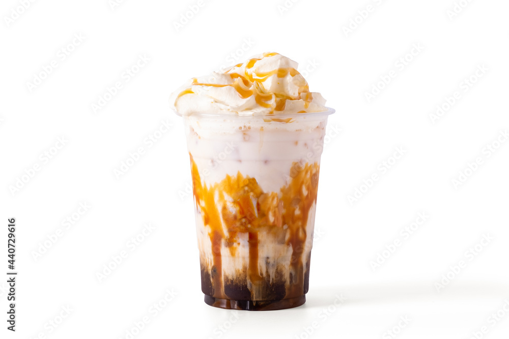 caramel macchiato coffee with caramel and whipping cream in glass Isolate on white background. cafe menu concept.