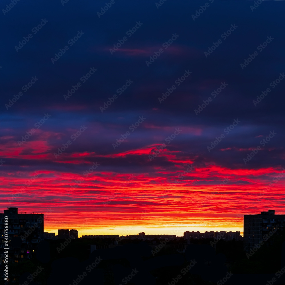 Dark colorful sky at sunset above dark silhouettes of city buildings