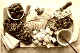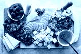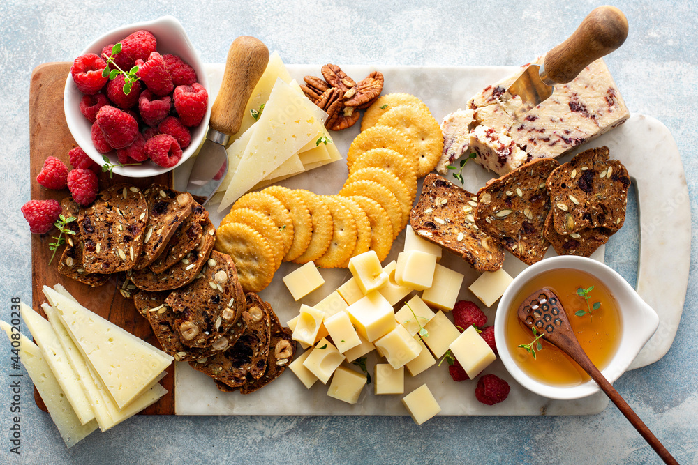 Cheese and snacks board with raspberry and crackers