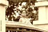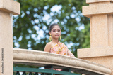 An Asian schoolgirl dressed in traditional Thai clothes stands at the railing of a bridge in a park.