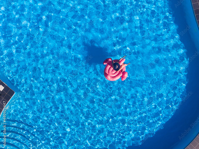 Summer holidays, enjoying summer vacations during quarantine. Aerial drone view of woman on flamingo pool float in pool.
