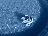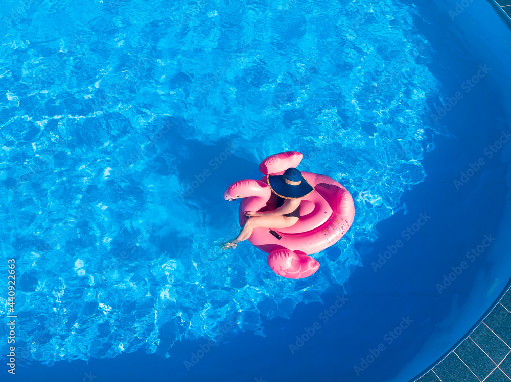 Summer holidays, relaxation. Woman on flamingo pool float in pool, drone aerial view. Enjoying summer vacations during quarantine.