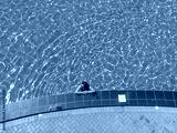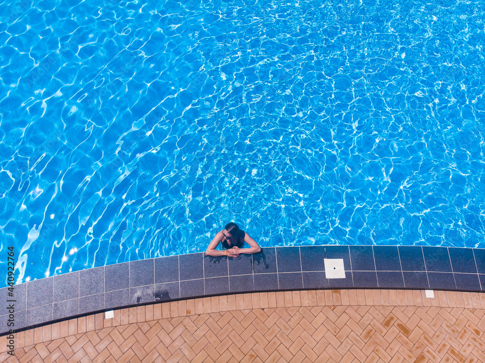 Summer holidays, relaxation. Woman in pool, drone aerial view. Enjoying summer vacations during quarantine.