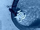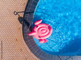 Unicorn flamingo float in blue water background, inflatable swim tube. Pool party, summer holidays, beach vacation. Fantasy swim flamingo ring for summer pool trip. Drone top view from above