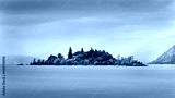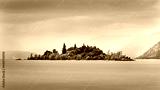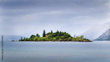 Ruby Island in Lake Wanaka with background mountains in the mist, Otago Region, South Island