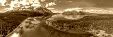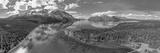 Kathleen Lake, Yukon, Canada during summertime view from high above with stunning turquoise water, mountain reflection, blue sky and partial clouds.