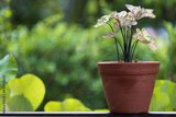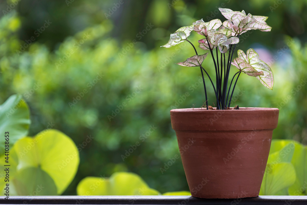A caladium plant with light pink curled leaves in an earthenware pot is used to decorate the area of the house.