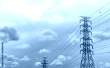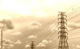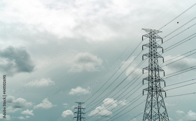 High voltage electric pylon and electrical wire with grey sky and white clouds. Electricity poles. Power and energy concept. High voltage grid tower with wire cable. Infrastructure. Power distribution