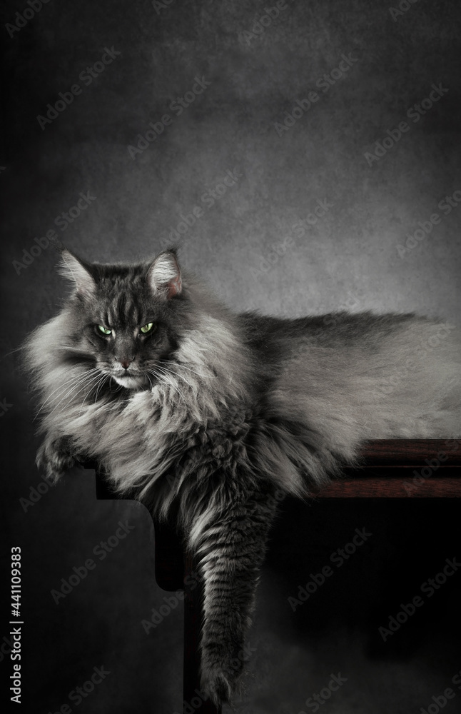 Adult silver blue Maine Coon cat looking at camera on a wood table with a grey background