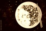Stir fry with chicken, mushrooms, sweet peppers and boiled rice. Chinese food. Top view, above