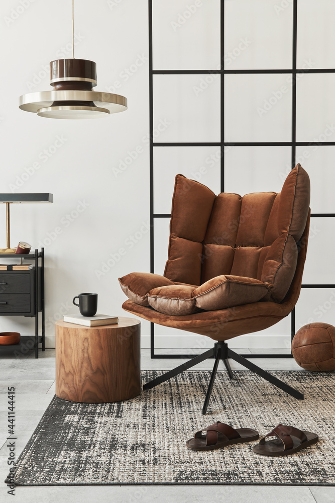 Modern interior of living room with design brown armchair, side table, pendatn lamp, loft wall, slippers, carpet, decoration and elegant personal accessories in home decor. Template.