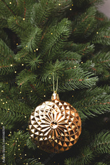 Shiny gold Christmas bauble hanging on a fir tree. New Year ornament with copy space.