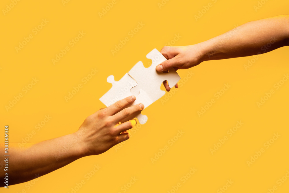 Holding puzzle. Closeup hand of connecting jigsaw puzzle. Business solutions, success and strategy concept. Two hands trying to connect couple puzzle piece on yellow background. Teamwork concept