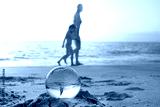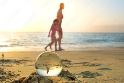 glass ball and people silhouets on sea beach. mother and kid on tropical ocean natural background. summer vacation, relax time, travel concept.