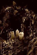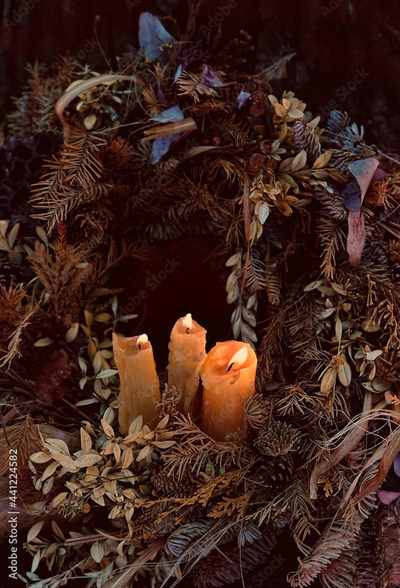 burning candles and autumn leaves, natural dark background. mysterious fairy scene, witch ritual scene. magic fall season. Mabon, Halloween holiday concept