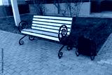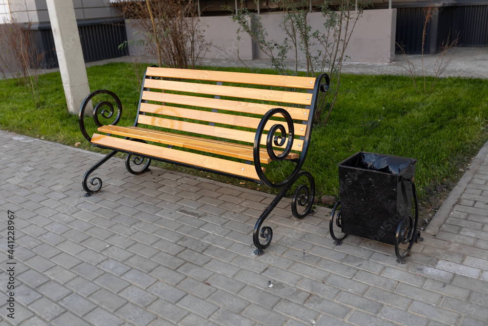 Classic wooden bench with metal armrests in a black metal trash can near an apartment building. Improvement of public space in the urban environment