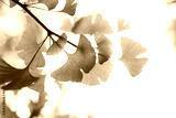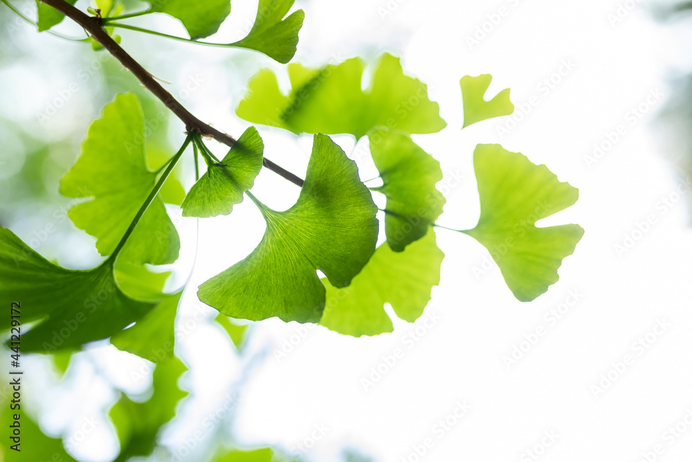 Brightly green leaves of Ginkgo biloba against a background of blurry foliage. Herbal medicine concept. Copy space. Soft focus.