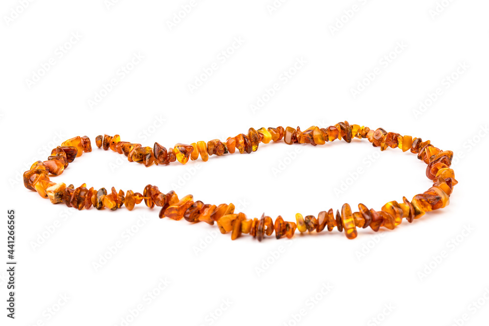 Baltic necklace made of Natural polished transparent honey luxury amber beads with inclusions on white. close up selective soft focus. Space for text