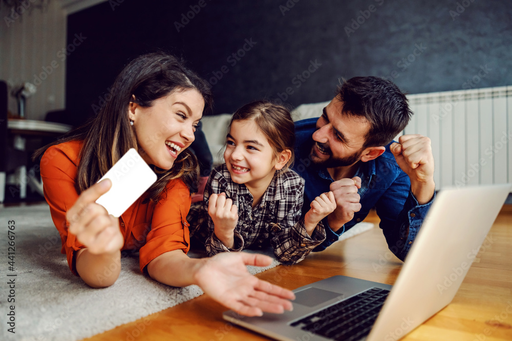 Happy family using laptop for online shopping. They are excited for purchase. Mom holding credit card.