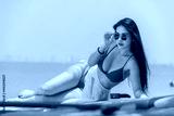 Portrait sexy beautiful Asian model wearing bikini swimming suite and sun glasses posing happy on beach with surfboard is water sport game and hobby leisure in summer holiday lifestyle.