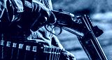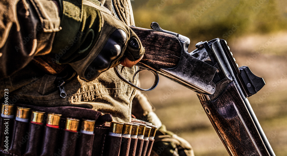 Hunter man. Hunting period, autumn season. Male with a gun. A hunter with a hunting gun and hunting form to hunt in an autumn forest. The man is on the hunt. Hunter with a backpack and a hunting gun