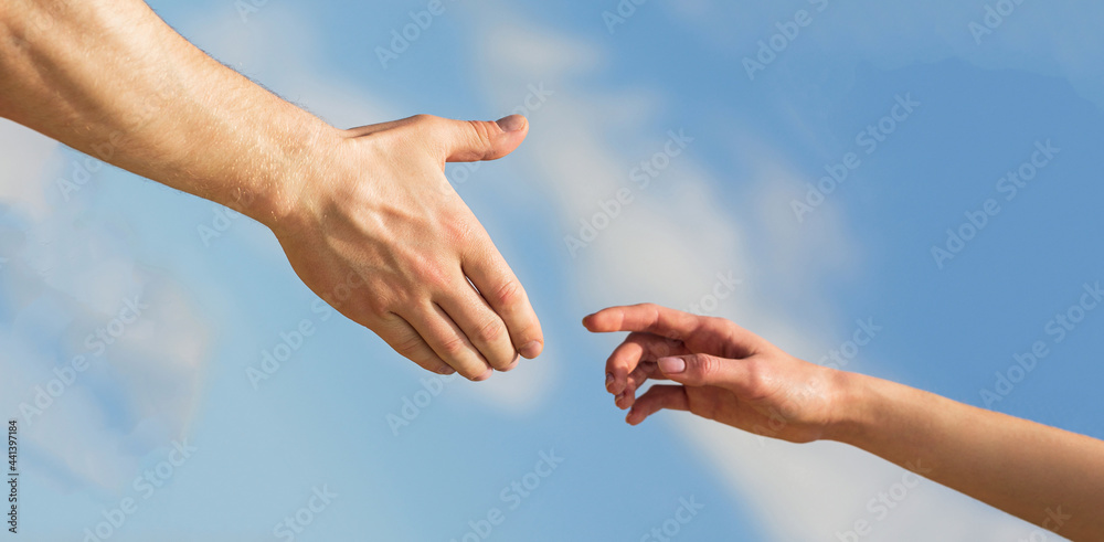 Lending a helping hand. Solidarity, compassion, and charity, rescue. Hands of man and woman reaching to each other, support. Giving a helping hand. Hands of man and woman on blue sky background