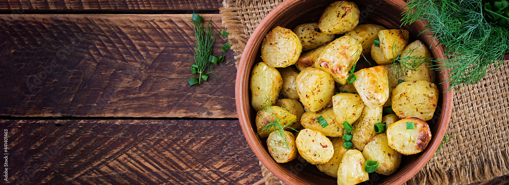 Baked potato wedges in a bowl on wooden table. Delicious lunch. Top view, overhead, banner