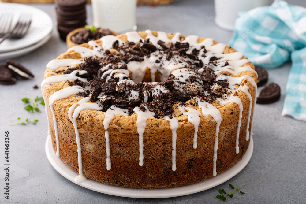 Bundt pound cake with chocolate sandwich cookies and glaze