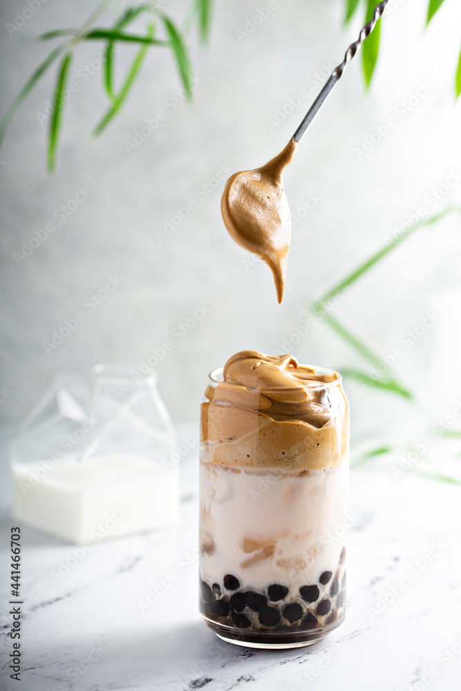 Boba dalgona coffee with tapioca pearls and whipped coffee