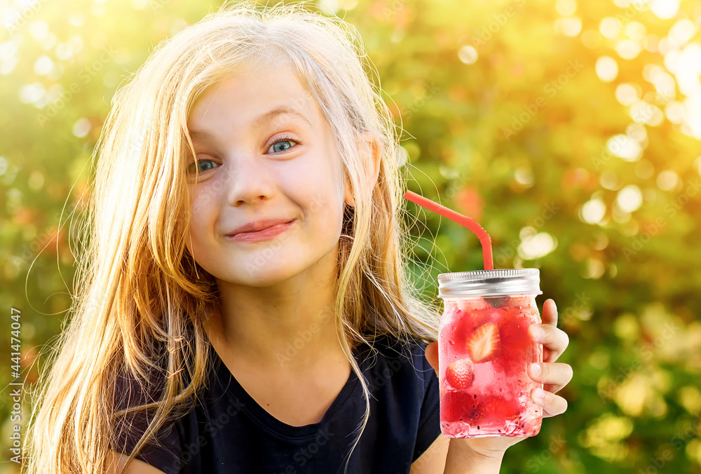 Cute funny little girl with frozen strawberry cocktail in drinking mason jar at sunset.