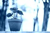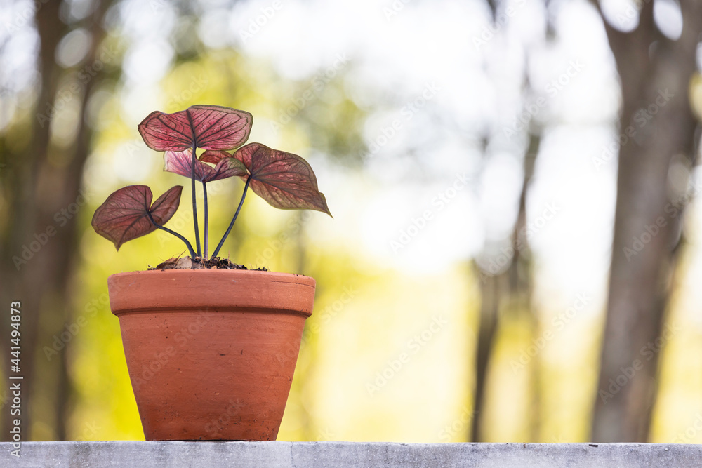 A caladium with heart-shaped red leaves is planted in a clay pot. Caladium is an ornamental plant that is known as the Queen of Foliage.