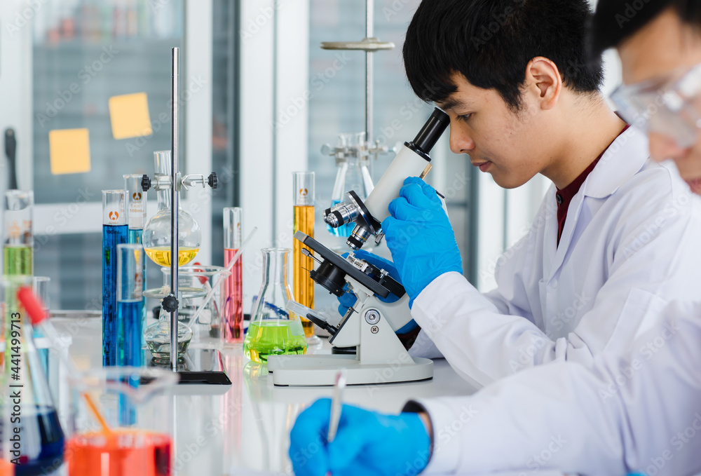 Asian young man sitting and looking through microscope and adult man wearing eyeglass do writing a note book both are chemist scientist and in uniform.Test tube with liquid put on table in laboratory