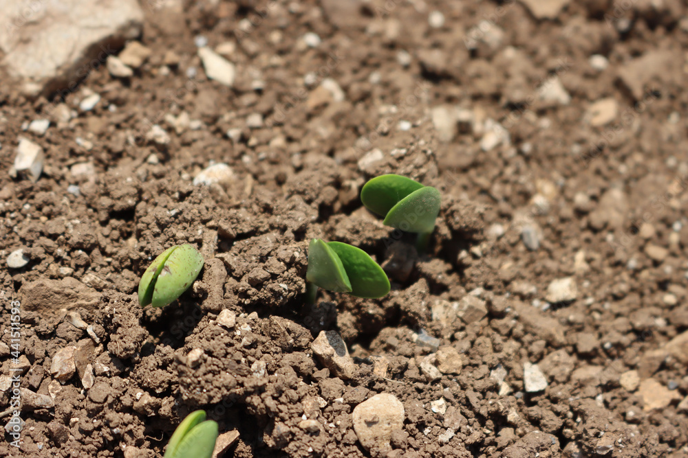 Fresh young soybean plants growing in the field. Soybean sprouts. Soybean field with young seedings in the soil on a sunny day