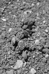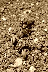 Fresh young soybean plants growing in the field. Soybean sprouts. Soybean field with young seedings in the soil on a sunny day